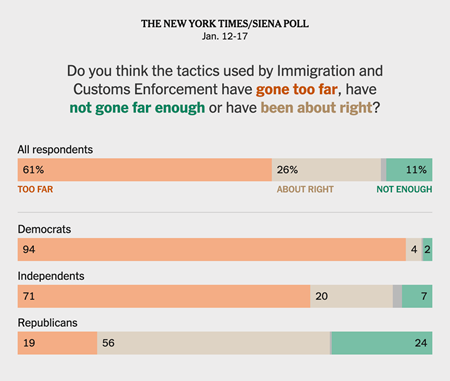 A new New York Times / Siena University poll shows deep public unease with how the Trump administration is handling immigration enforcement: while about half of voters approve of President Trump’s deportation policies and his handling of the U.S.–Mexico border, a substantial majority disapprove of Immigration and Customs Enforcement’s job performance and say ICE’s tactics have “gone too far,” with 63% disapproving of the agency’s work and 61% saying its approach is excessive, including many independents and some Republicans, reflecting widespread concern over interior raids and recent fatal encounters with federal agents.