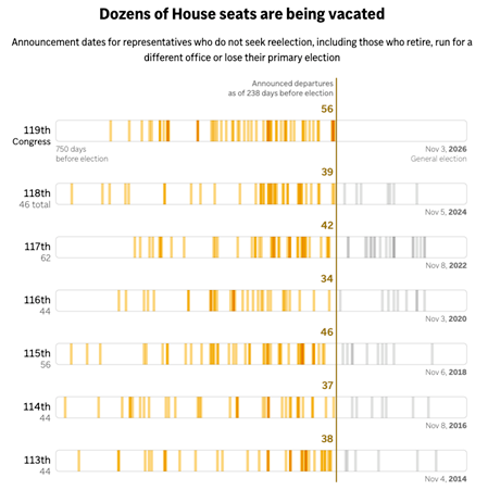 3) Wave of Congressional Retirements Expands the 2026 Battleground: An unusually high number of House members have already announced retirements ahead of the 2026 midterms, putting the next Congress on pace for significant turnover. The growing number of open seats, combined with redistricting changes and primary volatility, could expand the competitive map and force both parties to defend districts that would otherwise remain stable.