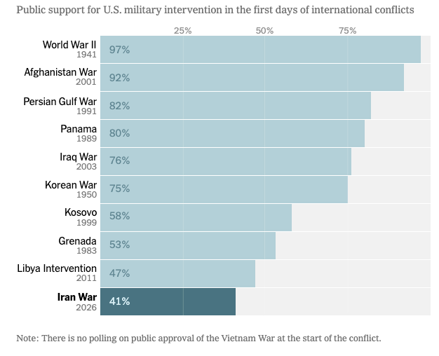 Even the highest levels of support recorded so far remain well below the early “rally” backing typically seen at the start of major wars such as World War II, the Korean War, or the Iraq War. The muted response highlights a more skeptical public toward new overseas military engagements, potentially shaping the political environment as the conflict unfolds and the 2026 midterm elections approach.