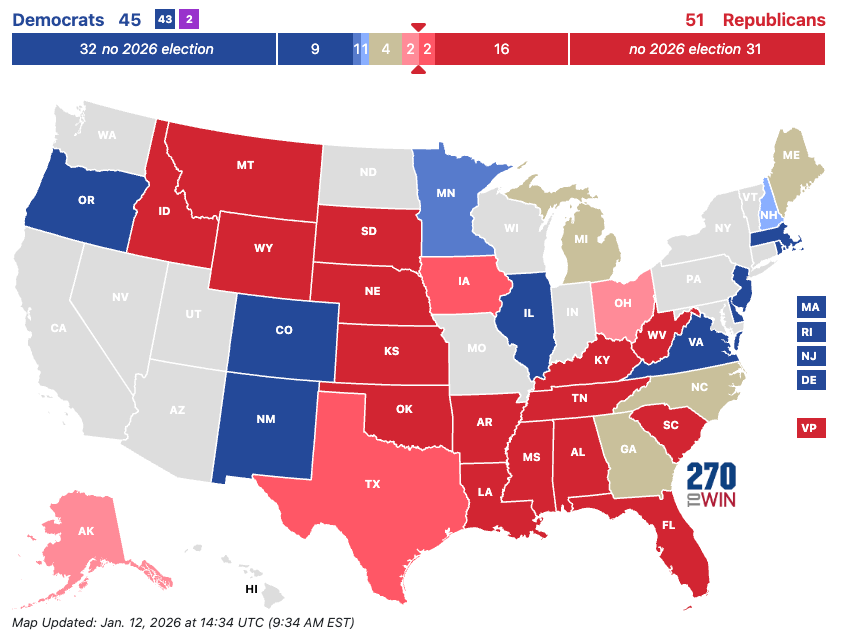 3) Notable Retirements Are Beginning To Pop: A growing number of senior lawmakers in Washington have begun announcing plans to step aside, signaling early turnover ahead of 2026. At the state level, Tim Walz announced he will not seek reelection, a decision that follows a period of heightened scrutiny and controversy in Minnesota and sets off an open-seat race in a closely watched state with an open Senate seat for the Democrats to defend.